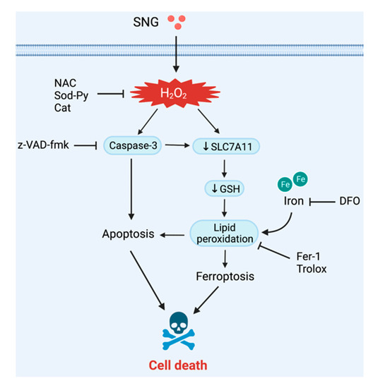 To date, emerging evidence indicates that ferroptosis often shares common pathways with other types of cell death. In light of this, recent studies have revealed that the ferroptotic agent-induced ER stress response plays an important role in the cross-talk between ferroptosis and apoptosis [21]. From the above experimental results, we propose that SNG induces ROS-mediated cervical cancer cell death through the crosstalk between two mechanisms of programmed cell death pathways—apoptosis and ferroptosis (Figure 5). This crosstalk mechanism has been further supported by three important results. First, ROS inhibitors completely reversed ferroptotic and apoptotic cell death. Second, inhibiting ferroptosis abolished the features of apoptosis and cell death. Third, suppressing apoptosis with z-VAD-fmk not only inhibited the features of SNG-induced apoptosis, but also inhibited the features of SNG-induced ferroptosis. In conclusion, our study provided potential mechanistic pathways for SNG-induced human cervical cancer cell death. These compelling results expanded our understanding of the clinical applications of SNG-based therapy against cervical cancer.