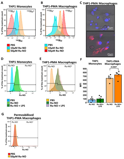 Ru-NO sensor uptake and detection in human THP1 monocytes and THP1-PMA macrophages. THP1 monocytes and macrophages were exposed to the Ru-NO sensor to assess sensor uptake and fluorescence detection. The histograms of 102Ru in (A) THP1 monocytes and (B) macrophages exposed to 10 and 50 µM of Ru-NO as assessed by Mass Cytometry (CyTOF). (C) Confocal microscopic images of THP1-PMA macrophages treated with PBS (top) and 50 µM Ru-NO (bottom) (red: Ru-NO, and blue: DAPI). Representative flow cytometry histograms of Ru-NO fluorescence in (D) THP1 monocytes and (E) THP1-PMA macrophages with/without LPS stimulation (F) with analyses. (G) Lack of Ru-NO fluorescence detection in permeabilised THP1-PMA macrophages by flow cytometry. Mean ± SEM of the mean fluorescence intensity (MFI) of independent experiments, and p values derived from a paired t-test (n = 5 replicates).