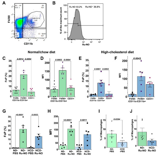Ex vivo uptake of Ru-NO by macrophages in aortic cell suspensions from atherosclerotic mice. (A) Representative plot for the distributions of aortic cell suspensions incubated with antibodies against CD11b and F4/80 markers. (B) Representative histogram demonstrating the shift in Ru-NO fluorescence in aortic cell suspensions. (C) Frequency of parental (FoP) and (D) mean fluorescence intensity (MFI) for Ru-NO fluorescence in myeloid cells (CD11b+F4/80−), macrophages (CD11b+F4/80+) and endothelial cells (CD31+) in aortic cell suspensions from chow-fed mice. (E). FoP and (F) MFI for Ru-NO fluorescence in aortic cell suspensions in high-cholesterol diet (HCD)-fed group. (G) FoP and (H) MFI in CD11b+F4/80+ macrophages comparing aortic cell suspensions from chow and HCD-fed groups with ex vivo addition of PBS or Ru-NO. Proportion of macrophages in all viable cells that had been incubated with (I) PBS and (J) Ru-NO. Mean ± SEM, p values derived from one-way ANOVA with Tukey post-hoc test for multiple comparisons across different groups (n = 5–6 mice/group).