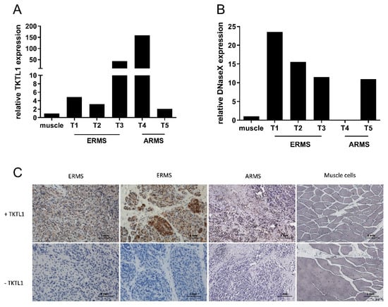 Five RMS tumor samples (ERMS (embryonal RMS) n = 3; ARMS (alveolar RMS) n = 2) were analyzed for the mRNA expression of TKTL1 and DNaseX/Apo10. After thawing, the tumor samples were mechanically homogenized, lysed, and subjected to total RNA extraction. The transcriptional mRNA expression was determined by reverse transcription and quantitative real-time PCR. Normal muscle tissue was used as reference.
