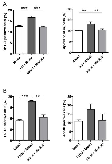 TKTL1 and Apo10 abundance in CD14+/CD16+ monocytes of co-cultured whole blood with RMS cells. The presence of TKTL1 and Apo10 in monocytes was measured after using the EDIM blood test via flow cytometry. Co-culture experiments with RD (A) and RH30 (B) cells show the uptake of the biomarkers in CD14+/CD16+ monocytes. White and grey bars indicate internal control with (grey) and without (white) medium. The data are presented as mean +/− standard error (SEM), n = 3; ** p < 0.01, *** p < 0.001 indicate statistical significance (ANOVA, Bonferroni correction).