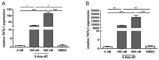Relationship of TKTL1 expression at the degree of DNA methylation. TKTL1 expression of RD (A) and RH30 cell lines (B) after treatment with the DNA methyltransferase inhibitor 5-Aza-dC (decitabine). For the quantification of mRNA levels, a quantitative RT-PCR was performed using TBP as the internal control. The expression is given as relative value against to the untreated control. The data are presented as mean +/− standard error (SEM), n = 3; * p < 0.05, ** p < 0.01, *** p < 0.001 indicate statistical significance (ANOVA, Bonferroni correction).
