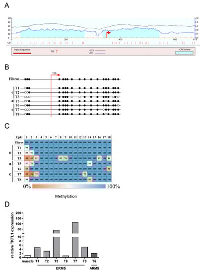 In order to investigate a correlation between DNA methylation of the TKTL1 promoter and TKTL1-mRNA expression, the expression analysis was also carried out with the abovementioned additional samples (Figure 5B,C). In the RMS samples, TKTL1 mRNA expression was the highest for tumor samples T3 and T7, which correlated with higher hypomethylation (Figure 5D). Only T6 was an exception, since un-methylated CpGs were found here, but TKTL1-mRNA expression was comparable to that of the control.