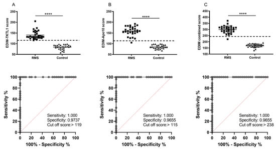 EDIM scores of the patients with rhabdomyosarcoma (RMS). Receiver operating characteristics (ROC) analysis of TKTL1, Apo10, and combined TKTL1/Apo10 EDIM cut-off score in RMS patients compared with healthy individuals. The true positive rates (sensitivity) are plotted as a function of the false positive rate (1—specificity) for measuring the cut-off point; ROC analysis for the diagnosis of RMS shows calculated cut-off value with highest diagnostic accuracy of TKTL1 (cut-off score > 119; sensitivity 1.000, 95% CI 0.8754–1.000); specificity 0.9737, 95% CI 0.8282–0.9982), Apo10 (cut-off score > 115, sensitivity 1.000, 95% CI 0.8754–1.000; specificity 0.9655, 95% CI 0.8282–0.9982), and combined TKTL1/Apo10 score (cut-off score > 238; sensitivity 1.000, 95% CI 0.8754–1.000; specificity 0.9655, 95% CI 0.8282–0.9982). The dotted line shows the 95% CI. The scatter plots represent (A) the EDIM-TKTL1 score (cut-off > 119), (B) the EDIM-Apo10 score (cut-off > 115), and (C) the combined EDIM-TKTL1/Apo10 score (cut-off > 238). The dotted lines indicate the cut-off values of the scores. **** p < 0.0001indicates statistical significance (Students T-Test).
