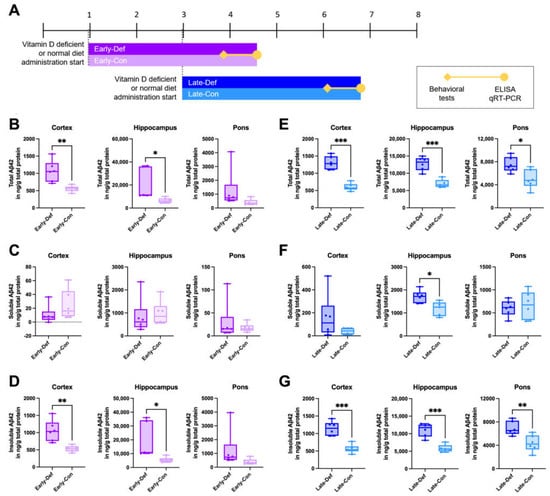 Vitamin D deficiency increased the Aβ load in both the early and late stages of AD model mice. (A) Experimental scheme of a vitamin D-deficient state in 5xFAD mice induced by the administration of a vitamin D-depleted (0 IU) diet. One-month-old mice in the Early-Def (n = 6) and Early-Con (n = 6) groups were given vitamin D-depleted and normal diets, respectively. Late-Def (n = 6) and Late-Con (n = 6) group mice were given a vitamin D-depleted diet and normal diet, respectively, starting from 3 months old. (B) The total Aβ42 levels in the cortex, hippocampus, and pons of the 4.5-month-old Early-Def and Early-Con groups were measured using ELISA kits. (C) Soluble and (D) insoluble Aβ42 levels were also represented. (E) The total Aβ42 levels in the cortex, hippocampus, and pons of the ~7-month-old Late-Def and Late-Con groups are indicated. (F) The soluble and (G) insoluble Aβ42 levels are also depicted. Dots represent the data of individual mice in each group. The data are presented by the mean ± SEM of each group. * p < 0.05, ** p < 0.01, and *** p < 0.001 by the Student’s t-test.