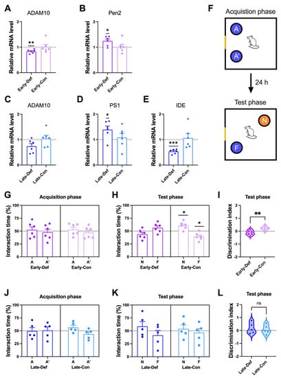 In the acquisition phase, both the Late-Def and Late-Con groups did not distinguish the two locations (Figure 2J). In addition, both groups displayed similar interaction times spent in both locations, with memory impairment in the test phase (Figure 2K). Moreover, there were no differences between the two groups in the discrimination index (Figure 2L). The Late-Con was given a behavioral test at ~6.5 months old, and these 5xFAD mice already exhibited 4- to 5-month-old memory impairment []. Thus, these results were derived from the floor effects of memory impairment in the AD model mice.