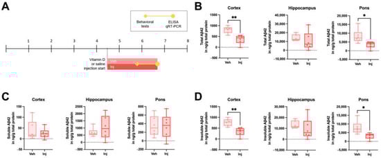 Due to the observed etiologic effects of vitamin D deficiency on AD pathophysiology, we further explored the potential therapeutic effect of vitamin D on AD by generating a vitamin D supplementation state by the intraperitoneal injection of a vitamin D solution in 5xFAD mice starting at 4.5 months old (Figure 3A). The total Aβ42 levels were significantly lower in the cortex and pons of the vitamin D-injected group compared to the vehicle-injected group (Figure 3B). There were no significant differences in the soluble Aβ42 levels between the two groups (Figure 3C), but the Inj group exhibited significantly lower insoluble Aβ42 levels in the cortex and pons (Figure 3D). In addition, the intermediate stage of the vitamin D-injected AD model mice exhibited decreased Aβ42 levels compared to the vehicle groups (Figure S3B–D).
