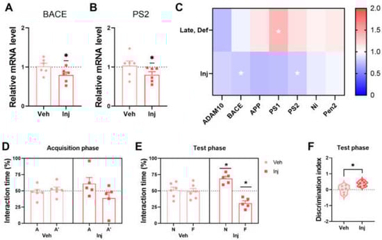 Vitamin D supplementation resulted in less Aβ processing and improved memory in AD model mice. (A,B) The results of the qRT-PCR analysis of mRNA expression of (A) BACE and (B) PS2 in the Veh (n = 6) and Inj (n = 6) groups are exhibited. (C) A heatmap of the qRT-PCR results of Aβ processing-related gene expression is illustrated to compare the Veh (n = 6) and Inj (n = 6) groups. The interaction time spent in each location of the Veh (n = 6) and Inj (n = 5) groups in (D) the acquisition phase and (E) test phase are illustrated. (F) The discrimination indexes of the Veh and Inj groups are shown. Dots represent the data of individual mice in each group. Interaction times are expressed for each location as a percentage of the total exploration time and were tested for the statistical difference against a 50% theoretical mean (one-sample t-test). The data are presented by the mean ± SEM of each group. * p < 0.05 by the Student’s t-test.