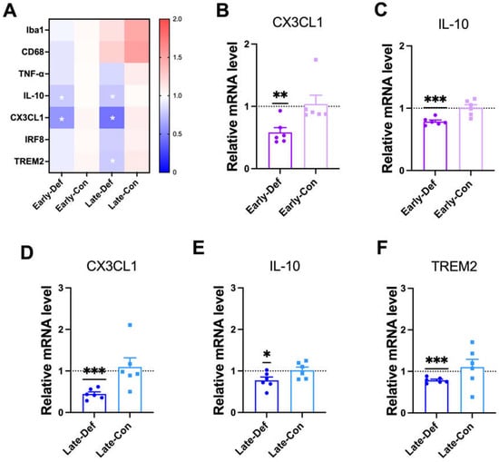 CX3CL1, which is mediated in microglia migration and adhesion [], was downregulated in the Early-Def group (Figure 5A) and Late-Def group (Figure 5D). IL-10, which is an inflammatory cytokine released by activated microglia, was also reduced by vitamin D deficiency in the early (Figure 5C) and late stages (Figure 5E). The Early-Def group revealed no significant difference in Ionized calcium-binding adapter molecule1 (Iba1), cluster of differentiation receptors (CD68), tumor necrosis factor α (TNF-α), interferon regulatory factor 8 (IRF8), and TREM2 expression compared to the Early-Con group (Figure S6A–E). Iba1 and CD68 are widely used markers of general microglial activation []. The late-Def group revealed a significantly lower mRNA level of TREM2 (Figure 5F), but there were no significant changes in the IRF8 gene mRNA level (Figure S6H). IRF8 and TREM2 genes are related to the capacity of microglial phagocytic responses [,].