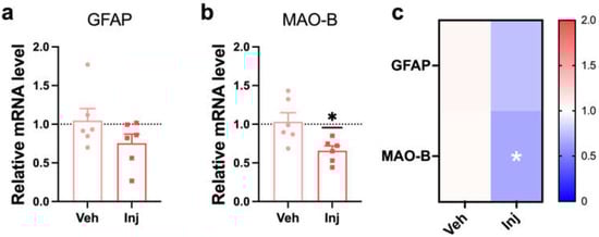 Vitamin D supplementation in a late-stage attenuated reactive astrocyte. (A,B) The qRT-PCR results from the analysis of the mRNA expression of (A) GFAP and (B) MAO-B in the Veh (n = 6) and Inj (n = 6) groups are shown. (C) A heatmap of the relative levels of mRNA expression related to a reactive astrocyte was used to compare the Veh (n = 6) and Inj (n = 6) groups. The data are presented by the mean ± SEM of each group. * p < 0.01 by the Student’s t-test.