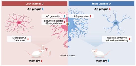 Regulating the Aβ pathway may be a beneficial therapeutic target for AD treatment or prevention, and this pathway may be attenuated by the vitamin D levels, as there is numerous epidemiologic evidence to support the pathological role of vitamin D deficiency in the development of AD, including prospective cohort studies and meta-analyses [,,,,,,]. Numerous studies have shown that neurodegenerative diseases like multiple sclerosis, Parkinson’s disease, and AD are related to vitamin D deficiency [,,].