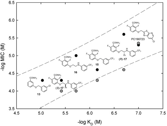 Correlation of antimicrobial activity (MIC) with binding affinity (KD) of inhibitor binding to the BsFtsZ benzamide site at the interdomain cleft. Data from representative analog compounds are shown together with their chemical structures. Filled circles, B. subtilis MIC; dotted circles, methicillin-resistant S. aureus MIC. The dashed lines are the 95% predictive intervals for B. subtilis MIC vs KD values of 15 analogs [16].