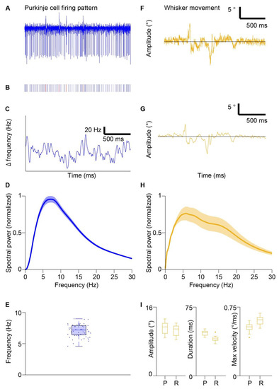 Oscillatory frequencies of simple spiking and whisking kinematics. (A) shows an example of raw trace of a PC recording before spike sorting. (B) shows the spike train of SSs (in blue) and complex spikes (in red) extracted from the raw trace of (A). (C) shows corresponding instantaneous frequency from (A,B). (D) shows a power spectrum of SS instantaneous frequency during periods of movement, calculated with the continuous wavelet transform. The line displays the mean and shaded areas display ± SD, n = 59 cells. (E) shows a boxplot of frequencies with a maximum power of power spectra summarized in (D), 7 ± 1 Hz (mean ± SD), n = 59 cells. The value of each cell is shown as a dot. (F) shows an example of raw whisker trace. (G) shows a filtered whisker trace from (F). (H) shows a power spectrum of whisking during periods of movement, n = 13 mice. Line displays mean and shaded areas display ± SD. (I) shows a boxplot with amplitude, duration, and maximum velocity of protractions (P) and retractions (R) during voluntary whisking. Boxplots indicate mean and interquartile ranges. The dots indicate the outliers.