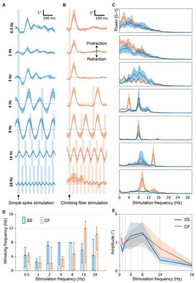 We hypothesized that stimulation of PCs at the preferred oscillatory frequencies of the climbing and mossy fiber systems would be particularly effective in driving motor output. To test this hypothesis, we used head-fixed, awake mice expressing channelrhodopsin-2 specifically in PCs or in their climbing fiber to perform optogenetic stimulation and extracellular single-unit recordings. Spontaneous or induced whisker movements were monitored with a high-speed camera. During spontaneous whisking, both SS instantaneous frequency and whisker movement exhibited oscillatory behavior with peaks within the theta-band in their power spectrum. Subsequently, we elicited either simple or complex spikes at the frequencies of 0.5, 1, 2, 4, 8, 14, and 28 Hz. We found that 8 Hz is the preferred stimulation frequency at which the biggest movement is induced. Interestingly, oscillatory whisker movements at 8 Hz were generated also when SS bursting was induced at 2 and 4 Hz. Such oscillatory whisker movements were induced exclusively when SS activity was modulated and never via climbing fiber activation.