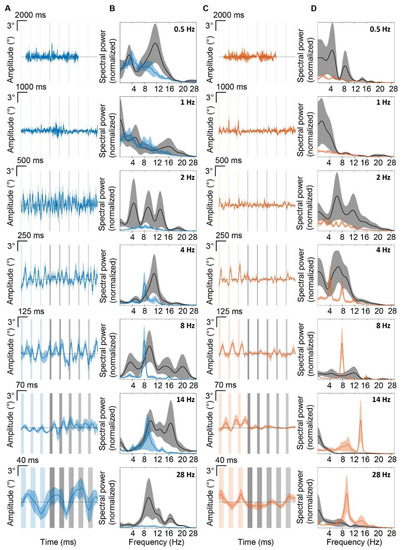 Entrainment of whisker movement is sustained by Purkinje cell activity. (A) shows mean whisker traces before and after the end of a train of stimuli of PC stimulation (left). Stimuli are indicated by blue bars. Grey bars indicate the timing at which subsequent movement could be expected if the whisker would be keeping oscillating at the frequency of stimulation (left). (B) shows power spectra during the period of SS stimulation (blue lines) and the power spectra during 1000 ms after the last stimulus (grey lines). Shaded areas indicate mean ± SEM. (C,D) are the same as (A,B), but for climbing fiber stimulation (orange lines). Note that the power spectra are different for the period before and after the end of the stimulation.