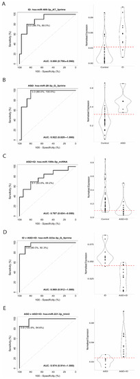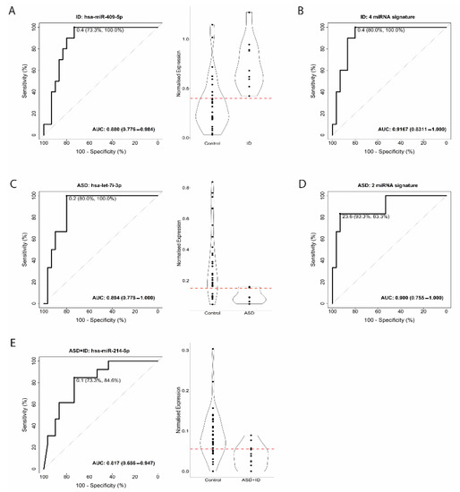Receiver operating characteristic (ROC) curve analysis and violin plots for Intellectual Disability (ID), and Autism Spectrum Disorder (ASD), ASD + ID, as well as for discriminating between ID and ASD + ID and between ASD and ASD + ID. (A). ROC curve analysis for the isomiRs showed 90% sensitivity and 80% specificity for hsa-miR-409-5p for hsa-miR-409-3p_AT_3prime in discriminating between controls (TSC without TANDs) and ID corresponding to an AUC of 0.87. (B). hsa-miR-28-3p_G_3prime showed a 100% sensitivity and 80% specificity in discriminating between controls (TSC without TANDs) and ASD, corresponding to an AUC of 0.922. (C). For the discrimination between controls and ASD + ID hsa-miR-199b-5p_miRNA showed 69.2% sensitivity and 80% specificity, corresponding to an AUC of 0.787. (D). For the comparison between ID and ASD + ID, hsa-miR-410-3p_miRNA showed an 84.6% sensitivity and a 90% specificity, corresponding to an AUC of 0.931. (E). For the discrimination between ASD and ASD + ID, hsa-miR-221-3p_trim3 showed an 84.6% sensitivity and 100% specificity, corresponding to an AUC of 0.974. X-axis ROC curve: 100-Specificity in percentage (%); Y-axis ROC curve: Sensitivity in percentage (%); X-axis violin plot: Groups; Y-axis violin plot: Normalized expression. The red dotted line in each violin plot indicates the threshold that optimizes group separation.