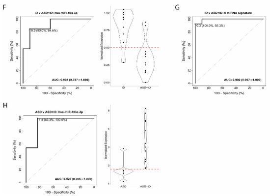 Receiver operating characteristic (ROC) curve analysis and violin plots for Intellectual Disability (ID), and Autism Spectrum Disorder (ASD), ASD + ID, as well as for discriminating between ID and ASD + ID and between ASD and ASD + ID. (A). ROC curve analysis for the miRNAs showed 100% sensitivity and 73.3% specificity for hsa-miR-409-5p in discriminating between controls (TSC without TANDs) and ID, corresponding to an AUC of 0.880. (B). Panel of four miRNAs signature discriminating between controls (TSC without TANDs) and ID. (C). For the discrimination between controls (TSC without TANDs) and ASD, hsa-let-7i-3p showed a 100% sensitivity and 80% specificity corresponding to an AUC of 0.894. (D). Panel of two miRNAs signature discriminating between controls (TSC without TANDs) and ASD. (E). For the discrimination between controls (TSC without TANDs) and ASD + ID, hsa-miR-214-5p showed 84.6% sensitivity and 73.30% specificity, corresponding to an AUC of 0.817. (F). For the comparison between ID and ASD + ID, hsa-miR-494-3p showed an 84.6% sensitivity and a 90% specificity, corresponding to an AUC of 0.908. (G). Panel of six miRNAs signature discriminating between ID and ASD + ID. (H). For the discrimination between ASD and ASD + ID, hsa-miR-103a-3p showed a 100% sensitivity and 83.3% specificity, corresponding to an AUC of 0.923. X-axis ROC curve: 100-Specificity in percentage (%); Y-axis ROC curve: Sensitivity in percentage (%); X-axis violin plot: Groups; Y-axis violin plot: Normalized expression. The red dotted line in each violin plot indicates the threshold that optimizes group separation.