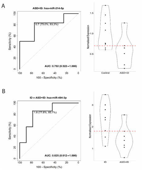 Receiver operating characteristic (ROC) curve analysis and violin plots for PCR validation of Autism Spectrum Disorder + Intellectual Disability (ASD + ID), as well as for discriminating between ID and ASD + ID. (A). ROC curve analysis for the miRNAs showed 83.3% sensitivity and 75.0% specificity for hsa-miR-214-5p in discriminating between controls (TSC without TANDs) and ASD + ID, corresponding to an AUC of 0.792. (B). For the discrimination between ID and ASD + ID, hsa-miR-494-3p showed an 85.7% sensitivity and 77.8% specificity, corresponding to an AUC of 0.825. X-axis ROC curve: 100-Specificity in percentage (%); Y-axis ROC curve: Sensitivity in percentage (%); X-axis violin plot: Groups; Y-axis violin plot: Normalized expression. The red dotted line in each violin plot indicates the threshold that optimizes group separation.
