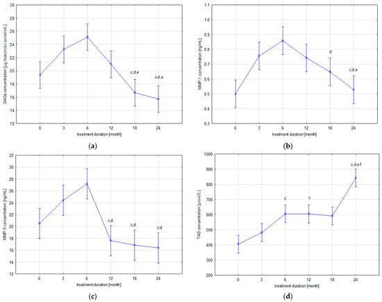Dynamics of changes in plasma levels of GAGs (a), MMP-1 (b), MMP-3 (c), and TAS (d) in patients with JIA before and during etanercept therapy; c p < 0.05 compared to T3 group; d p < 0.05 compared to T6 group; e p < 0.05 compared to T12 group; f p < 0.05 compared to T18 group.