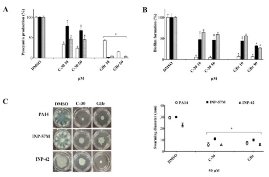 Effect of GBr and C-30 on QS regulated virulence factors in P. aeruginosa PA14 wild-type strain (white columns), and clinical isolates INP-57M (black columns) and INP-42 (gray columns). DMSO = dimethyl sulfoxide (vehicle). (A) Pyocyanin production at 10 and 50 µM furanone concentration (pyocyanin production was normalized according to the O.D.600nm value). (B) Biofilm formation at 10 and 50 µM furanone concentrations. (C) Swarming motility at 50 µM furanones concentration. Mean values that are significantly different from those of the control group (DMSO) are shown. Student’s t test for non-paired samples was used (* p ˂ 0.05). At least three independent experiments were carried out (* p ˂ 0.05).