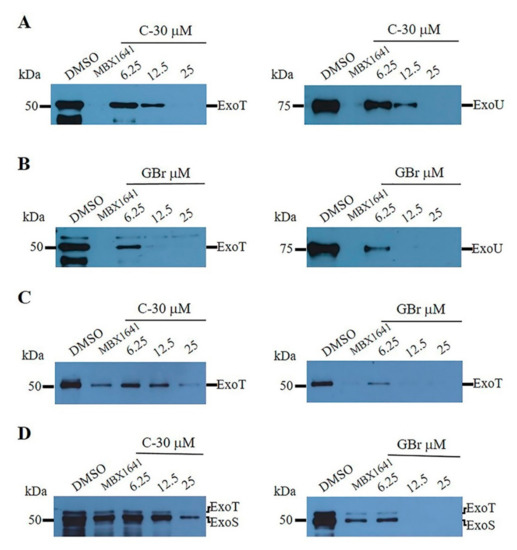 Furanones inhibit the secretion of type III effector proteins of P. aeruginosa strains in a dose-dependent manner. (A,B) the effect of C-30 and GBr on the secretion of ExoT and ExoU effectors in the wild-type strain PA14. (C,D) the effect of furanones on the secretion of ExoT and ExoS effectors in the clinical isolates INP-42 (C) and INP-57M (D). In the INP-42 strain, secretion of ExoS and ExoU was not detected. In the INP-57M strain, secretion of ExoU was not detected. DMSO = dimethyl sulfoxide (vehicle). MBX 1641 is a phenoxyacetamide derivative used as a positive control for T3SS inhibition (25 µM).