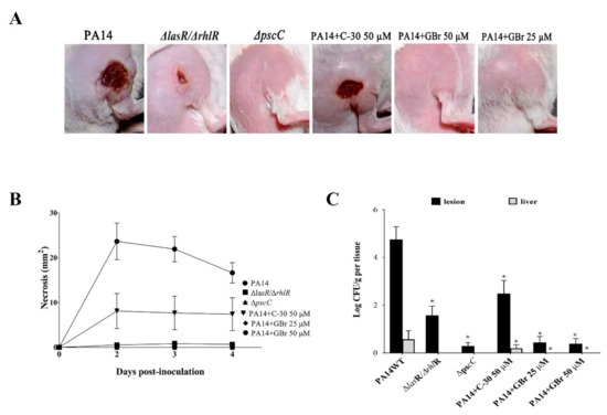 Previous reports showed that subcutaneous inoculation of mice with P. aeruginosa induces abscess formation, necrosis, and death [37,38]. Using this model, we evaluated the protective effect of GBr in comparison with C-30. The PA14 mutant strains ΔlasR/ΔrhlR (lacking the QS regulators LasR and RhlR) and ΔpscC (the T3SS is not assembled) were used as negative controls (Figure 4).