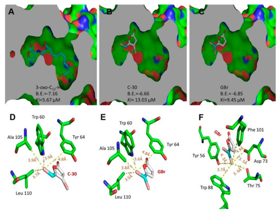 C-30 is a synthetic derivative whose structure resembles that of furanones isolated from D. pulchra, the first described molecules with QS inhibition activity [15,16]. The proposed mechanism of action of C-30 involves antagonism to the LasR transcriptional regulator [15,39]. GBr is a structural isomer of C-30 but varies in the gem position of the bromines (Figure 1). Molecular docking analysis showed that the binding site of the LasR receptor has a higher theoretical affinity for GBr (B.E. = −6.85, Ki = 9.45 µM) compared with C-30 (B.E. = −6.66, Ki = 13.03 µM), although none was greater than the theoretical affinity determined for the natural autoinducer, the 3-oxo-C12-HSL (B.E. = −7.16, Ki = 5.67 µM) (Figure 5A–C). Similarly, the change of position of the Br to C5 in GBr allowed the establishment of interactions with other amino acids within the active site, such as Tyr 56, Asp 73, Trp 88, Phe 101, and Thr 75 (Figure 5F).
