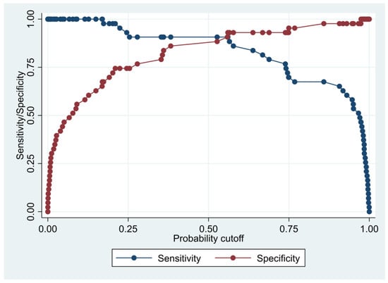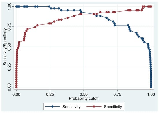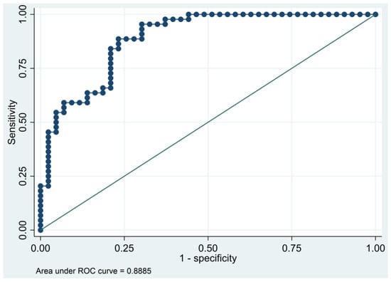 This model has a Pseudo R-squared = 0.436, an AUC = 88.9% (82.1–95.6%), reaching a sensitivity of 95.45% with a specificity of 69.77% (Table 8 and Figure 3 and Figure 4). For the regression coefficients reported in Table 7 and predicted probability cut points reported in Table 8, the following model identified cases and controls with the specified sensitivity and specificity: