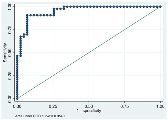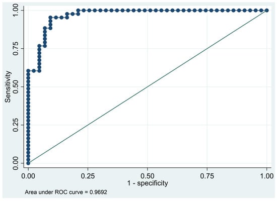 This model has a Pseudo R-squared = 0.605, an AUC = 95.4% (95% CI 91.5–99.3%), reaching a sensitivity of 97.67% with a specificity of 74.42% (Table 4 and Figure 1 and Figure 2). For regression coefficients reported in Table 3 and predicted probability cut points reported in Table 4, the following model will identify cases and controls with the specified sensitivity and specificity: