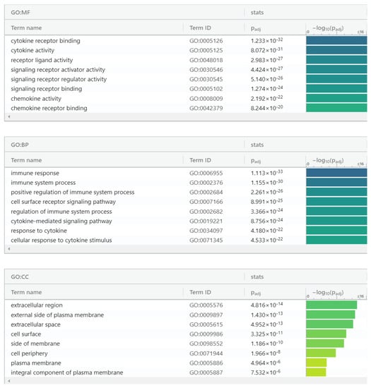 We used gProfiler as the classification tool for proteomic enrichment data analysis. For the Immuno-oncology panel, proteins (Figure 7) are classified into groups according to their molecular function, biological processes, and protein classes. Regarding molecular function, proteins were categorized into: cytokine receptor binding, cytokine activity, receptor-ligand activity, signaling receptor activator activity, signaling receptor regulator activity, signaling receptor binding, chemokine activity, and chemokine receptor binding. For biological processes, proteins were categorized into: immune response, immune system process, positive regulation of immune system process, cell surface receptor signaling pathway, regulation of immune system process, cytokine-mediated signaling pathway, response to cytokine, and cellular response to cytokine stimulus. Contrastingly, for protein class, proteins were categorized into: extracellular region, external side of plasma membrane, extracellular space, cell surface, side of membrane, cell periphery, plasma membrane, and integral component of plasma membrane. Reactome tool grouped these proteins into eight pathways: chemokine receptors bind chemokines, interleukin-10 signaling, cytokine signaling in immune system, immune system, signaling by interleukins, peptide ligand-binding receptors, TNFR2 non-canonical NF-kB pathway, class A/1 (Rhodopsin-like receptors).