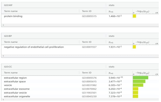 The same analysis was performed for the Target 96 Oncology III panel (Figure 8). Proteins were classified into groups according to their molecular function, biological processes, and protein class. The molecular function categories were: protein binding. The biological processes were: negative regulation of endothelial cell proliferation. The protein class categories were: extracellular region, extracellular space, vesicle, extracellular exosome, extracellular vesicle, extracellular organelle, and extracellular membrane-bounded organelle. Reactome tool analysis classified these proteins into four pathways: CLEC7A/inflammasome pathway, Defective CSF2RA causes SMDP4, and Defective CSF2RB causes SMDP5, Innate Immune System.