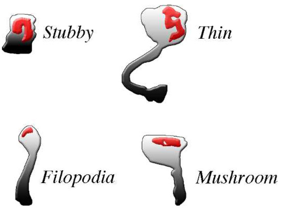 The spines, small protrusions stemming from dendritic shafts, are the second type of post-synaptic structures activated by signals delivered by pre-synaptic transmission. As already mentioned, the presence of spines, typical of dendritic fibers, is appreciable at some distance from the cell body of most excitatory neurons (Figure 1). In inhibitory neurons the spines account for only a small fraction (about 10%) of the post-synapses, except for GABAergic neurons, in which the percentage is higher [32,33]. All spines exhibit dynamic forms, dependent on the received excitatory and inhibitory inputs. The structure of most established spines is recognized according to four morphological categories, critical for normal brain functions: filopodia, stubby, thin, and mushroom (Figure 2), generated separately or by switching from each other in a variety of conditions [34,35].