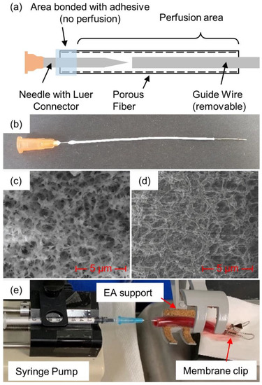 Plasmin-membrane-perfusion setup: (a) schematic view and (b) actual view of membrane, (c) SEM photos at 10,000× magnification of fiber cross-section and (d) inside surface, along with (e) full membrane-perfusion system with blood clot inside tube.