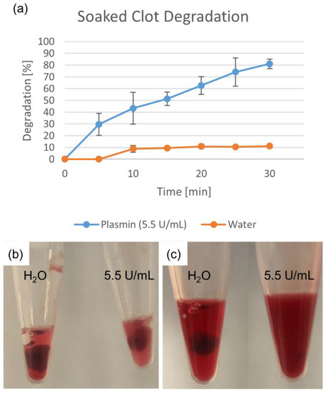 Degradation due to plasmin soaking. Deionized water degradation control accounts for mechanical breakdown. Percentage shown as mean ± standard deviation (n = 3). (a) Water- and plasmin-soaked clots are shown (b) initially and (c) after 25 min.