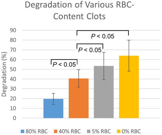 Plasmin injection degradation percentages in the fresh EAs was consistently higher than for the aged EAs by approximately 14 ± 3% (n = 6, p = 0.19). The degradation of clots with varying RBC content, by membrane-perfused plasmin, are shown in Figure 4. Degradations are highest for 0% RBC clots, with degradation decreasing as RBC content increases. Statistically significant (p < 0.05) differences were observed between all RBC-content clots except between 0% and 5%.
