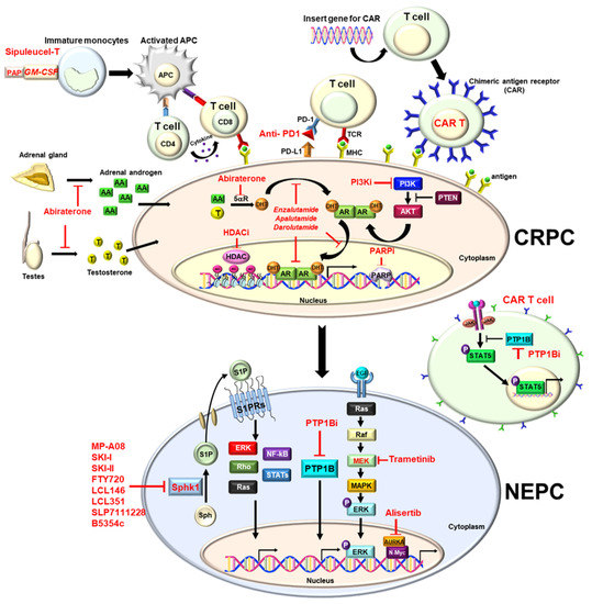 Clinical observation indicates that about 20–25% of CRPC patients recurred from ADT [6,7], harbored distinct cell features from classical adenocarcinoma in prostate; some carcinoma cells exhibit neuroendocrine phenotypes with neuronal markers expression and neuronal factors secretion in an endocrine fashion [8], which is considered as neuroendocrine PCa (NEPC), a subpopulation of t-CRPC. However, small-cell carcinoma of prostate (SCPC) with very low incidence (1% of the prostatic malignancies) has been identified from the primary site. Although SCPC is associated with a highly proliferative area of tumor mass and poor prognosis, it is still sensitive to chemotherapy [9,10]. On the other hand, NEPC is known to resist many therapeutic regimens. Currently, no effective targeted therapy for NEPC has been approved by the FDA. Based on molecular profiling from NEPC patients, this article has discussed several potential new therapeutic strategies for this disease.