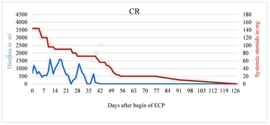 Patient with CR and significantly less diarrhea and usage of systemic steroids. The patient reported a decrease in abdominal pain during ECP.