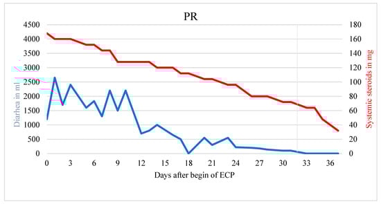 A total of five of nine patients showed response to therapy with ECP (two patients complete response, three patients partial response). Exemplary cases of therapy response are demonstrated in Figure 1, Figure 2 and Figure 3. Figure 1 displays a patient with complete response to ECP in terms of both, reduction of diarrhea (r = −12.389; p < 0.001) and reduction of systemic corticosteroid (r = −1.368; p < 0.001) (Figure 1).
