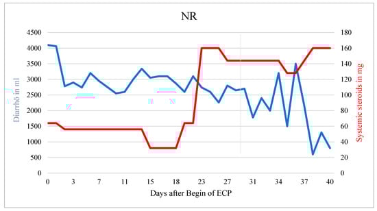 Patient with NR. Corticosteroids had to be increased during ECP due to hematochezia. Diarrhea decreased over time but no significant treatment response was observed in this patient.