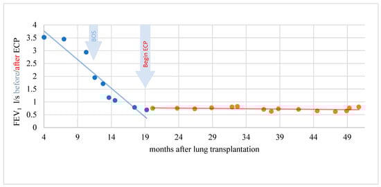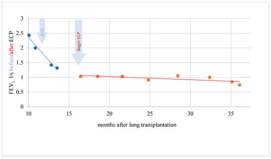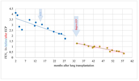 The treatment options for BOS are limited and a lack of control of this disease is the main barrier to better long-term survival after lung transplantation. In the literature, ECP in combination with standard immunosuppressive therapy is the most tolerable and most effective therapy with the highest evidence under salvage therapies (level C, recommendation class IIb) [9]. Overall, studies for ECP in BOS after lung transplantation are limited and the available data are based on expert opinions, studies with small numbers of patients, and retrospective analyses. Nevertheless, several studies showed an improvement or stabilization of FEV1 after the start of ECP and also improved survival rates compared to the control group [9,18,19,20,21]. Unfortunately, for the majority of patients in the present study, we were unable to reduce the decline in lung function with ECP therapy significantly. This result confirms that progressive BOS is very difficult to treat despite existing multimodal therapy. One of the reasons for the therapeutic challenge is the diverse course of the disease. In the present study, the BOS was clinically very heterogeneous with varying degrees of manifestation and either slow worsening in lung function over years or rapid loss of lung function within a few months. Regarding the individual response groups, it is noticeable that five patients who did not respond to therapy were already at an advanced BOS stage > 1 at the beginning of ECP. This indicates a tendency that an advanced BOS stage might be associated with a poorer response to therapy. The prospective study by Jaksch et al., in which 51 patients received ECP in addition to triple drug immunosuppression, azithromycin, and proton pump inhibitors, shows a better treatment response to ECP in the lower BOS stage (p = 0.05) [19]. The majority of patients had BOS stage 3 at the start of ECP treatment (68%). In the present study, the majority of patients had stage 3 at the start of ECP, too. Nevertheless, the results show that even with advanced stage 3 disease, therapy success can be achieved in the sense of a significant reduction in the rate of the fall in FEV1 (l/s/month) after the start of ECP therapy. Observational studies suggested that the BOS-related decline in FEV1 was not continuous. According to Lama et al., the decline in FEV1 should be greatest in the first six months and then stabilize [22]. With regard to the treatment response and the start of therapy with ECP, there was no correlation in the present study. Although the patient with the shortest interval between diagnosis and start of ECP treatment responded significantly to ECP, other patients who also started therapy early (≤3 months) did not show a significant response. The optimal start of therapy using ECP has not yet been clearly defined. The decision to start therapy with ECP is made in each individual case by the treating pneumologist. Benden et al. recommend an early start of therapy because developing fibroproliferation of the small respiratory tracts is hardly reversible with ECP [9]. With regard to an early start of therapy, the retrospective study by Isenring et al. showed better long-term survival over a period of five years for patients with BOS after lung transplantation who started ECP therapy in BOS stage 1 [23]. Although patients with BOS stage > 1 were still alive in the present study, the best quality of life without the need for oxygen therapy was shown for patients who started ECP therapy early in BOS stage 1. In most of the studies, ECP therapy was predominantly performed with the UVAR XTS® system. According to Chionis et al., who compared the Therakos UVAR XTS® and CELLEX® systems for the first time in patients with BOS after lung transplantation, the same response rates were found with regard to a reduction in FEV1 decrease and survival [24]. Regarding the duration of treatment, long-term treatment is recommended in response to therapy in order to maintain the clinical response [25]. In the present study, the two patients with significant treatment responses received ECP over several years. However, ECP was continued for as long as possible even in patients who showed no significant response. Despite long-term ECP therapy, none of the patients was able to stop drug immunosuppression.
