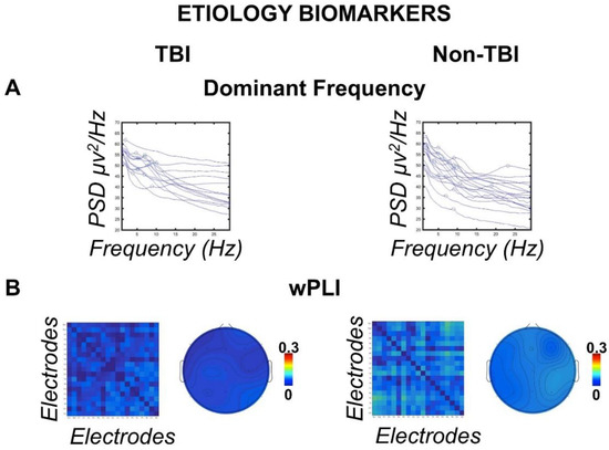 Etiology biomarkers. (A) Single-subject power spectral density (PSD) in the frequency range (1–30 Hz) divided into traumatic (TBI) and nontraumatic (non-TBI) etiologies. The circles identify the dominant frequency peaks showing a distribution of the peaks toward slower frequencies in the TBI group. (B) Connectivity matrices between scalp electrodes of the weighted phase lag index (wPLI) for TBI and non-TBI groups showing stronger global connectivity in the non-TBI group. Topographies show the grand mean wPLI connectomes for each electrode.