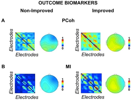 Outcome biomarkers. Connectivity matrices between scalp electrodes of the (A) partial coherence (PCoh) and the (B) mutual information (MI) for improved and nonimproved patients. Both figures show stronger connectivity for improved patients. Topographies show grand mean PCoh and MI connectomes for each electrode.