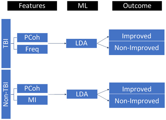 EEG features selected for traumatic (TBI) and nontraumatic (non-TBI) patients and included in the linear discriminant analysis (LDA) for clinical outcome prediction. LDA parameters were as follows: discriminant type = diagLinear (all classes had the same diagonal covariance matrix), gamma = 1, and delta = 0. PCoh = partial coherence, Freq = dominant frequency, MI = mutual information, ML = machine learning.