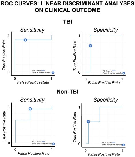 ROC curves. The ROC curves for sensitivity and specificity of the linear discriminant analyses on the patients’ clinical outcome (TBI vs. non-TBI patients).