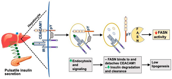 Additionally, CEACAM1 directly regulates insulin signaling. The insulin–insulin receptor complex formation and internalization are rapidly followed by binding of CEACAM1 to SHP2 phosphatase to sequester it and sustain persistent phosphorylation of insulin receptor substrate-1 and -2 (IRS-1 and IRS-2), key insulin signaling molecules [1,11]. IRS-1/2 signals through the PI3 kinase to maintain insulin action as vesicular insulin degradation occurs. As previously discussed [1], the coordinated binding of FASN to the same phosphorylated tyrosine residue (Y488) at which SHP2 binds to CEACAM1 positions CEACAM1 phosphorylation in response to an acute rise in insulin as a unifying mechanism regulating insulin sensitivity and clearance in hepatocytes. This is consistent with the dominant expression of insulin receptor, CEACAM1, and FASN in hepatocytes that are rapidly exposed to acute rises of insulin in the portal vein through the fenestrae of the liver capillaries, as opposed to other peripheral tissues in which the insulin passage is tightly regulated by the endothelial cells of their vasculature [12].