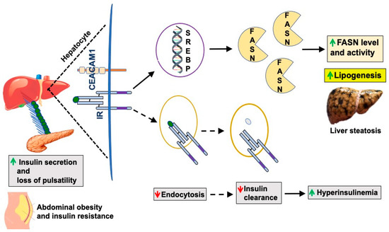 Fatty acid synthase (FASN) binds to CEACAM1 to pull it off and facilitate insulin dissociation from its receptor to allow insulin degradation in the acidic milieu of late endosomes and recycling of the receptor to the plasma membrane (reviewed in [1]). Binding of phosphorylated CEACAM1 to FASN represses its enzymatic activity and limits de novo lipogenesis to prevent fat accumulation in the liver in the face of the high portal insulin levels [6]. In this manner, insulin acutely represses de novo lipogenesis under normal physiologic conditions. We posited that CEACAM1 phosphorylation by pulses of released insulin constitutes a main protective mechanism against the higher levels of insulin in the portal vein, not only by mediating hepatic insulin clearance and maintaining the homeostatic level of insulin, but also by binding to FASN and maintaining low fatty acid synthesis in hepatocytes [6], thus preventing hepatic steatosis. This acute negative effect of insulin on de novo lipogenesis is in contrast to its chronic lipogenic effect whereby hyperinsulinemia, such as in conditions of elevated visceral/abdominal obesity and type 2 diabetes, activates SREBP-1c, a master transcriptional upregulator of the expression of lipogenic genes, including FASN [7]. This in turn leads to increased FASN activity and hepatic steatosis (Figure 2). As abdominal obesity and insulin resistance progress, the pulsatility of insulin release decreases [8,9], leading to defective insulin signaling in hepatocytes, including CEACAM1 phosphorylation and, subsequently, reduction in hepatic insulin clearance to contribute to chronic hyperinsulinemia. This demonstrates that insulin acutely represses lipogenesis and proposes that insulin resistance is inclusive of a defective insulin signaling against de novo lipogenesis as well as gluconeogenesis. This challenges the well-accepted notion of the selectivity of hepatic insulin resistance [10] that comprises a blunted acute effect of insulin on gluconeogenesis with a more positive effect of chronic hyperinsulinemia on lipogenesis.
