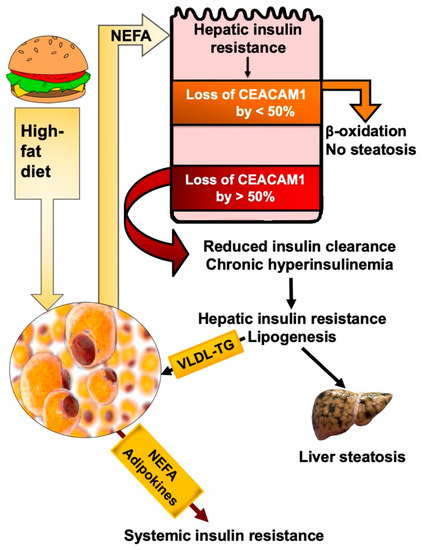 Given that insulin induces the transcriptional activity of Ceacam1 promoter [46], it is likely that NEFA activation of PKC causes the early reduction in Ceacam1 expression via its adverse effect on insulin signaling [72] shortly after high fat intake begins [25] (Figure 3). As stated above, this would initially provide a positive feedback mechanism on fatty acid β-oxidation in liver. Combined with sustained ligand-activated PPARα, which in turn binds to the Ceacam1 promoter to repress its transcription [92], this results in a progressive drop of Ceacam1 expression reaching >50% loss after 3–4 weeks of high fat intake [25]. As previously shown [25], the loss of CEACAM1 by >50% lowers hepatic insulin clearance to contribute to chronic hyperinsulinemia and its downregulatory effect on insulin receptor levels to sustain hepatic insulin resistance. Chronic hyperinsulinemia also causes the transcriptional activation of SREBP-1c to increase lipogenic gene expression [7] and favor de novo lipogenesis over fatty acid β-oxidation. Increased de novo lipogenesis does not only result in hepatic steatosis, but also in VLDL-triglyceride (VLDL-TG) repartitioning to WAT to induce visceral obesity and mediate a vicious cycle of NEFA mobilization along the adipocytes–hepatocytes axis. Eventually, chronic hyperinsulinemia causes insulin resistance in WAT by reducing Glut4-mediated glucose transport [93,94]. The concomitant increase in the pro-inflammatory state in this tissue leads to the release of adipokines and ensuing systemic insulin resistance.