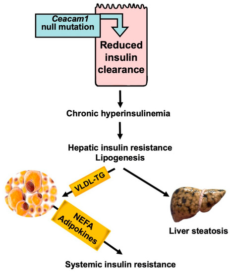 These early observations in cell systems are bolstered by the manifestation of reduced insulin clearance followed by chronic hyperinsulinemia and its downregulatory effect on insulin receptors to cause hepatic insulin resistance in mice with null mutation or liver-specific Ceacam1 gene deletion, and in mice with liver-specific inactivation of CEACAM1 (reviewed in [1]). These mice also exhibit chronic hyperinsulinemia-driven hepatic steatosis and other features of non-alcoholic fatty liver disease (NAFLD) (reviewed in [1]).