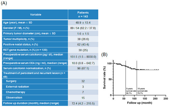 From January 2003 to December 2019, 143 patients were operated on for medullary thyroid cancer at Severance Hospital, Yonsei University College of Medicine, Seoul, Korea. Patient demographics and disease characteristics are presented in Figure 1A. The mean age of the patients was 48.9 years, and 62.2% of patients were females. The primary tumor diameter was 1.6 ± 1.5 cm, and tumor multiplicity was found in 26.6% of total patients. Positive nodal status was observed in 43.3% of patients, and RET mutation was confirmed in 25% patients. Median preoperative serum calcitonin and carcinoembryonic antigen levels were 151.5 pg/dL (range: 1.5–8030.0 pg/dL) and 10.0 ng/mL (range: 0.8–642.7 ng/mL), respectively. Serum calcitonin normalization (upper normal limit of 10 pg/mL) was found in 67.1% patients with MTC. Persistent and recurrent lesions were identified in 49 patients; of these patients, 32 underwent surgery, 3 received external radiation therapy, and 7 received chemotherapy. Of the patients who received chemotherapy, four received vandetanib, one received sorafenib and adriamycin, one received cabozantinib, and one received epirubicin and carboplatin. The median overall survival for 143 patients with MTC was 72.4 months (range: 4.2–215.5 months; Figure 1A). The patient survival rate was 90.7% at 5 years and 79.7% at 10 years after detection of TC (Figure 1B).