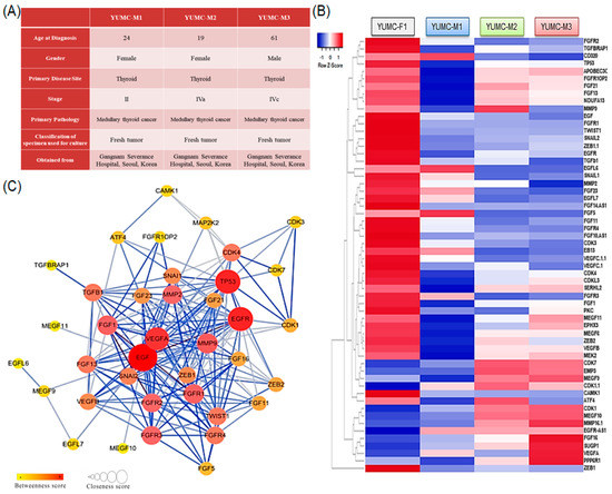 Varied MTC cell lines were isolated from the patient specimens (Figure 2A); YUMC-M1, M2, and M3 (first, second, and third isolated patient-derived MTC) were isolated from patients with MTC treated at the Severance Hospital, Yonsei University College of Medicine, Seoul, Korea. YUMC-M1, M2, and M3 were more aggressive than FTC, and metastasis was confirmed in these patients (Figure 2A). mRNA sequencing based on transcriptome analysis to identify a series of diversely expressed genes revealed that YUMC-M1, M2, and M3 cells were associated with a significant growth of the FGFR signaling pathway and EMT markers (ZEB (Zinc finger E-box-binding homeobox), SNAIL (Zinc finger protein SNAI1), and TWIST (twist family bHLH transcription factor)) were compared with YUMC-F1 (first isolated patient-derived FTC), as shown in Figure 2B. In MTC, the most remarkably raised genes were FGF (Fibroblast growth factor), FGFR, ZEB, SNAIL, and TWIST (twist family bHLH transcription factor) (Figure 2B). Kyoto Encyclopedia of Genes and Genomes pathway enrichment analysis demonstrated the FGFR signaling pathway and EMT interaction (Figure 2C).